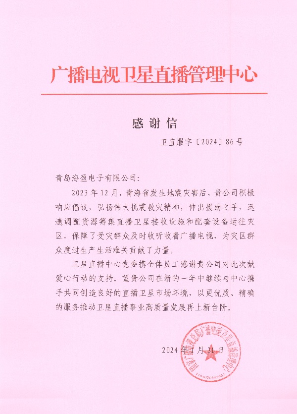 日前,青島海盈電子有限公司收到國家廣電總局廣播電視衛(wèi)星直播管理中心發(fā)來的《感謝信》,感謝信說:
